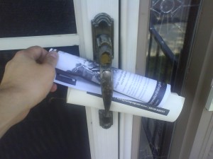 Approach the door slowly but not conspiciously. If there is a doorhandle, stick your leaflet beneath it. If not, put it under the screen door or the foot mat. Leave.